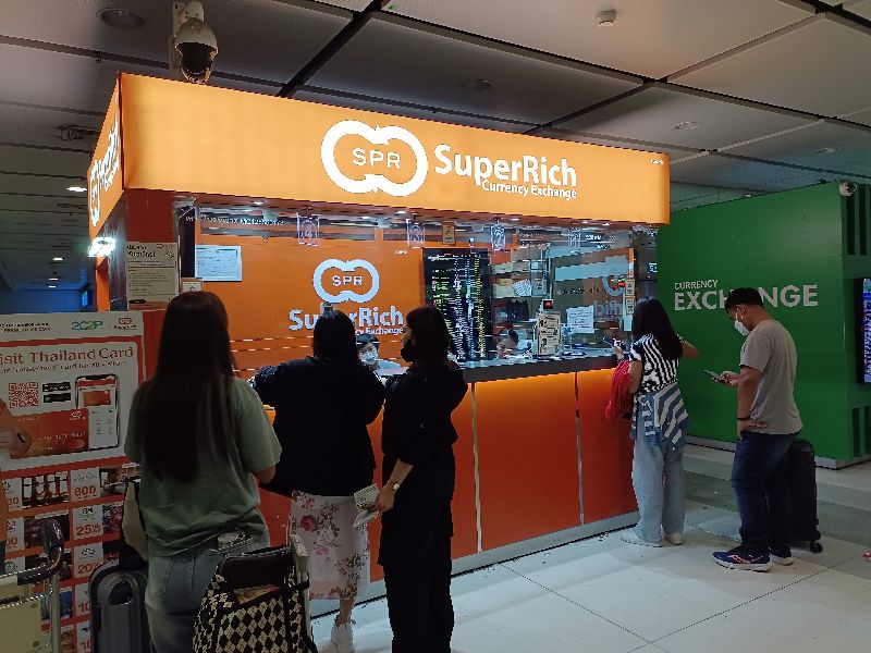 タイに到着すると、まず目に入るのが空港到着ロビーの銀行両替窓口です。利便性は高いものの、これらの窓口は手数料を上乗せしたレートを提示していることが多く、市内の両替所に比べてレートはかなり悪いです。
