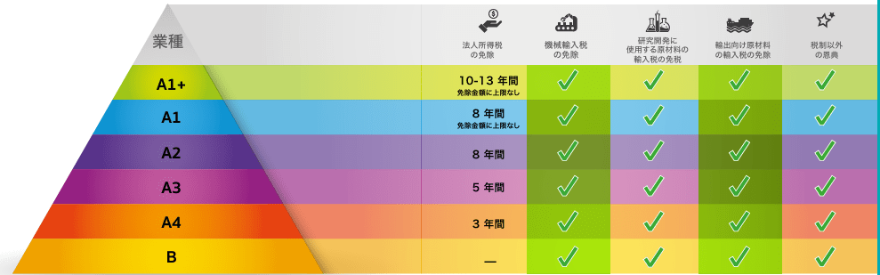 | 分類 | 法人税免除期間 | 主な対象事業例 |